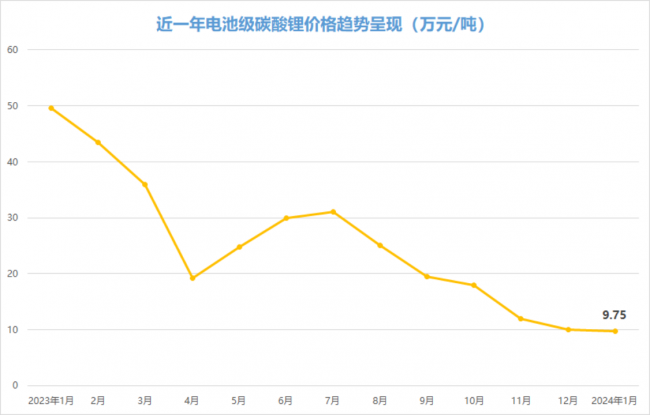 2024年1月8日,上海鋼聯(lián)數(shù)據(jù)顯示,電池級(jí)碳酸鋰現(xiàn)貨均價(jià)正式跌破10萬(wàn)元關(guān)口,報(bào)9.9萬(wàn)元/噸。最新在1月29日,電池級(jí)碳酸鋰報(bào)價(jià)保持在9.75萬(wàn)元/噸低位。