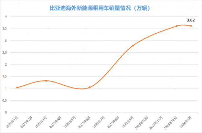 2024年1月,比亞迪在海外市場(chǎng)銷售了新能源乘用車36174輛,創(chuàng)下2022年7月有公開(kāi)記錄以來(lái)新高。