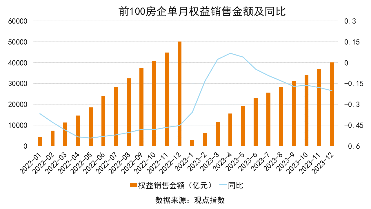觀點指數(shù)發(fā)布的“2023年1-12月房地產(chǎn)企業(yè)銷售表現(xiàn)”研究成果顯示,2023年全年,前100房企累計實現(xiàn)權(quán)益銷售金額40820億元,同比下降18.6%。