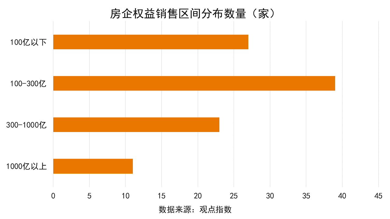 其中,權(quán)益銷售金額超過3000億元的房企僅1家。另外,權(quán)益銷售金額處于100-300億元之間的房企數(shù)量最多,達到40家。