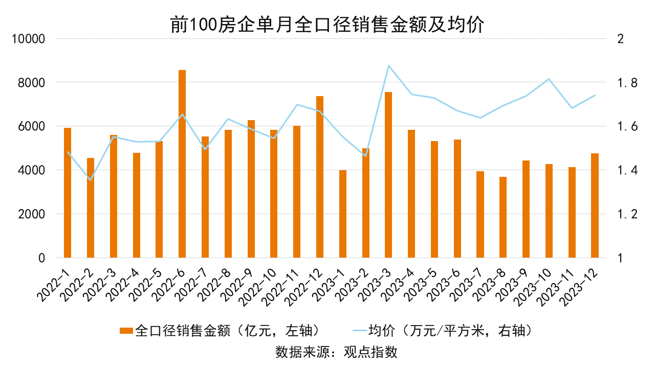 銷售均價方面,12月前100房企錄得總銷售面積3110萬平方米,銷售均價為1.79萬元/平方米,環(huán)比上升6.5%,同比上升7.3%。