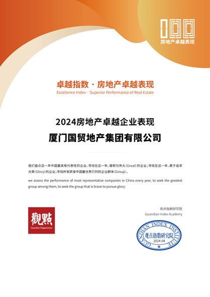 4月2日,觀點(diǎn)機(jī)構(gòu)發(fā)布《卓越指數(shù)·2024房地產(chǎn)卓越表現(xiàn)》研究成果,國貿(mào)地產(chǎn)憑借穩(wěn)健增長的規(guī)模、均衡提升的綜合實(shí)力,榮登“2024房地產(chǎn)卓越表現(xiàn)”第28名、“2024房地產(chǎn)商業(yè)模式卓越表現(xiàn)”第10名。