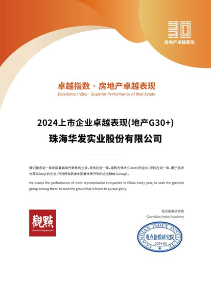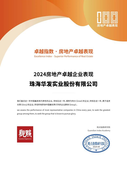 4月2日,以“ 信心的周期 “為主題的2024觀點年度論壇在廣州圓滿落幕,觀點指數(shù)研究院重磅發(fā)布《卓越指數(shù)o2024房地產(chǎn)年度卓越表現(xiàn)報告》。此次盛會上,華發(fā)股份憑借穩(wěn)健增長的業(yè)績、卓越的品牌力及不斷提升的綜合實力,榮獲”2024上市企業(yè)卓越表現(xiàn)(地產(chǎn)G30+)“”2024房地產(chǎn)卓越企業(yè)表現(xiàn)“獎項。