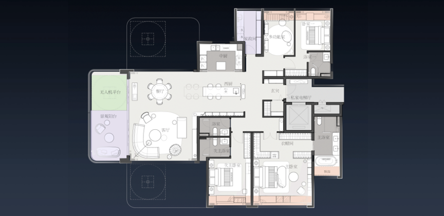 我們的研發(fā)團隊成功地采用環(huán)繞式、無干擾、三層錯層的設(shè)計手法,為每戶配備一個30㎡超大露臺,并確保露臺之間"同層不可見,上下不可視",同時還將三面采光的270°環(huán)幕客廳,植入到大平層產(chǎn)品中,生活私密性、空間舒適度、視野開闊性在此實現(xiàn)了完美地結(jié)合,充分呈現(xiàn)了四代宅空間的壯麗震撼!