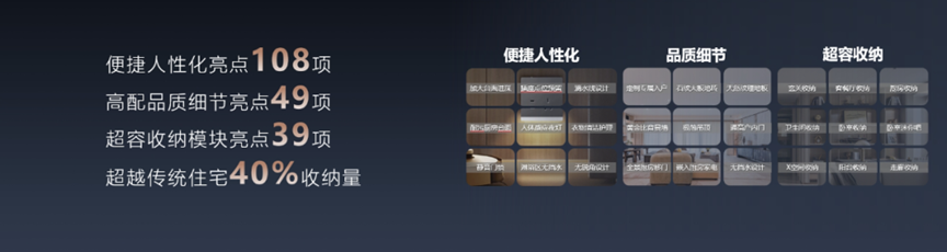 第二是迭代的空間模塊化設(shè)計。在戶型設(shè)計方面,更加關(guān)注極致景觀資源利用、南北通風(fēng)、超大面寬、全生命周期可變功能的設(shè)計理念。打造引領(lǐng)行業(yè)的各功能空間細節(jié)化設(shè)計,提升便捷人性化設(shè)計亮點108項,高配品質(zhì)細節(jié)亮點49項,超容收納模塊亮點39項,實現(xiàn)超越傳統(tǒng)住宅40%的收納量。