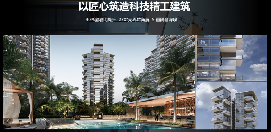 第四是科技精工建筑。我們做到了30%的窗墻比,270°大轉(zhuǎn)角的餐客廚空間,戶內(nèi)視野實現(xiàn)最大化,使得整體建筑簡約、現(xiàn)代又充滿科技感。在隔音、降噪方面,通過9重降噪措施,大大提升了舒適感。
