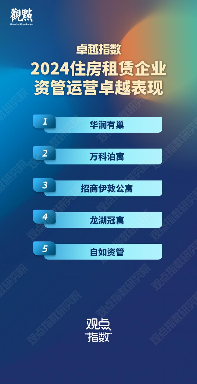 華潤有巢、萬科泊寓、招商伊敦公寓、龍湖冠寓和自如資管成功位列 “2024住房租賃企業(yè)資管運營卓越表現(xiàn)”名單。