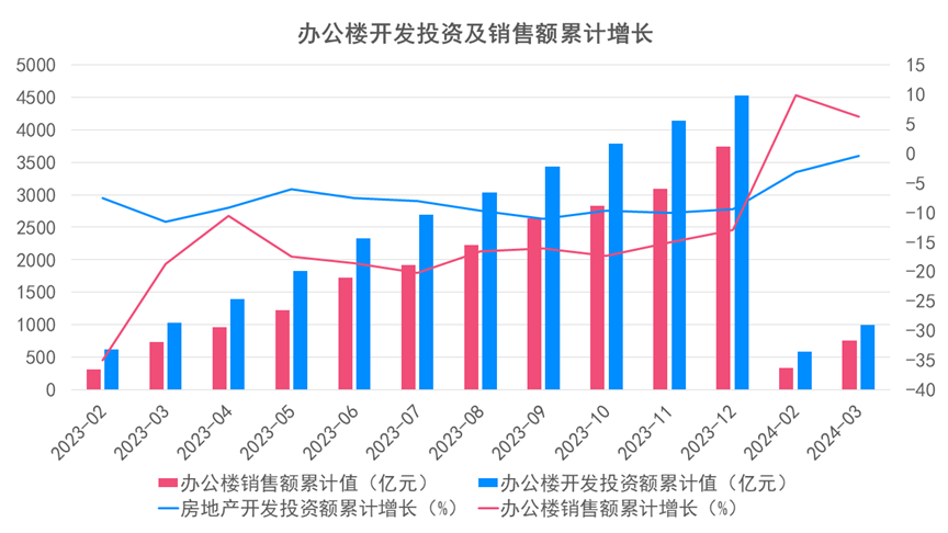 據(jù)國家統(tǒng)計局披露的數(shù)據(jù),2024年1-3月,全國辦公樓開發(fā)投資額累計989.6億元,累計下滑0.4%;辦公樓銷售額758.68億元,累計增長6.3%;辦公樓銷售面積580.55萬平方米,累計上漲11.9%。2023年全年辦公樓開發(fā)投資額累計數(shù)值為4530.78億元,累計下滑9.4%;辦公樓銷售額累計值3742.22億元,累計下降12.9%;辦公樓銷售面積2717.14萬平方米,累計下滑9%。