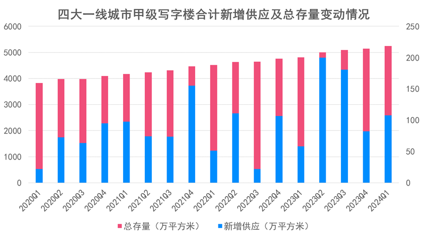 新增供應(yīng)面積的推動下,一線城市甲級寫字樓總存量面積繼續(xù)增長,上海、北京及深圳總存量面積均超千萬平方米。