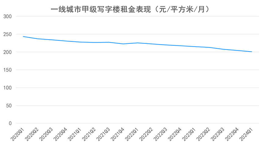 租金表現(xiàn)上,從圖中可以明顯看出,近幾年一線城市甲級寫字樓平均租金下滑趨勢明顯。從2022年Q1到2024年Q1,一線城市甲級寫字樓平均租金已連續(xù)多個季度下跌,租金下行壓力仍存。