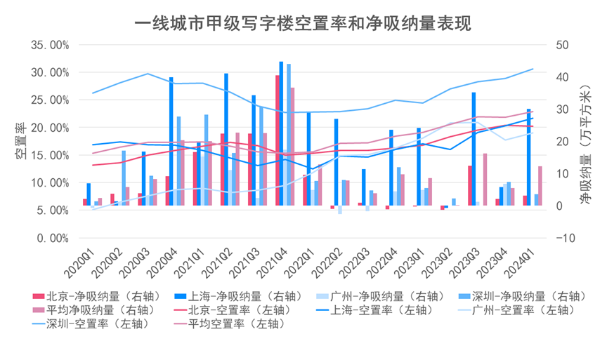 環(huán)比來看,僅北京空置率數(shù)據(jù)環(huán)比出現(xiàn)微降,對比2023年第四季度,上海、廣州及深圳甲級寫字樓空置率均出現(xiàn)不同程度攀升,環(huán)比提升1.4個百分點、1.3個百分點和1.7個百分點。