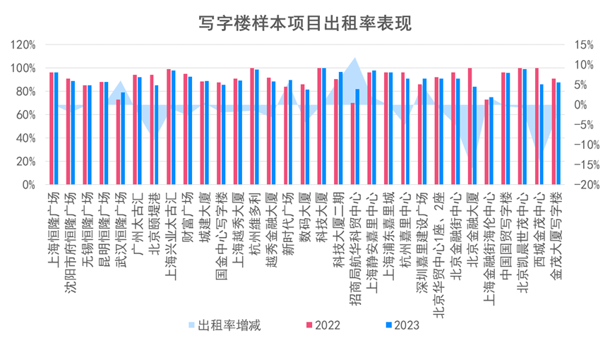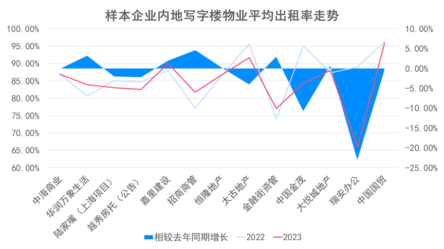 內(nèi)地在營寫字樓物業(yè)出租率表現(xiàn)上,2023年,圖表中13家樣本企業(yè)的平均出租率為84.45%,同比下滑2.21個百分點,商辦運營商在項目去化端仍面臨比較大的壓力。