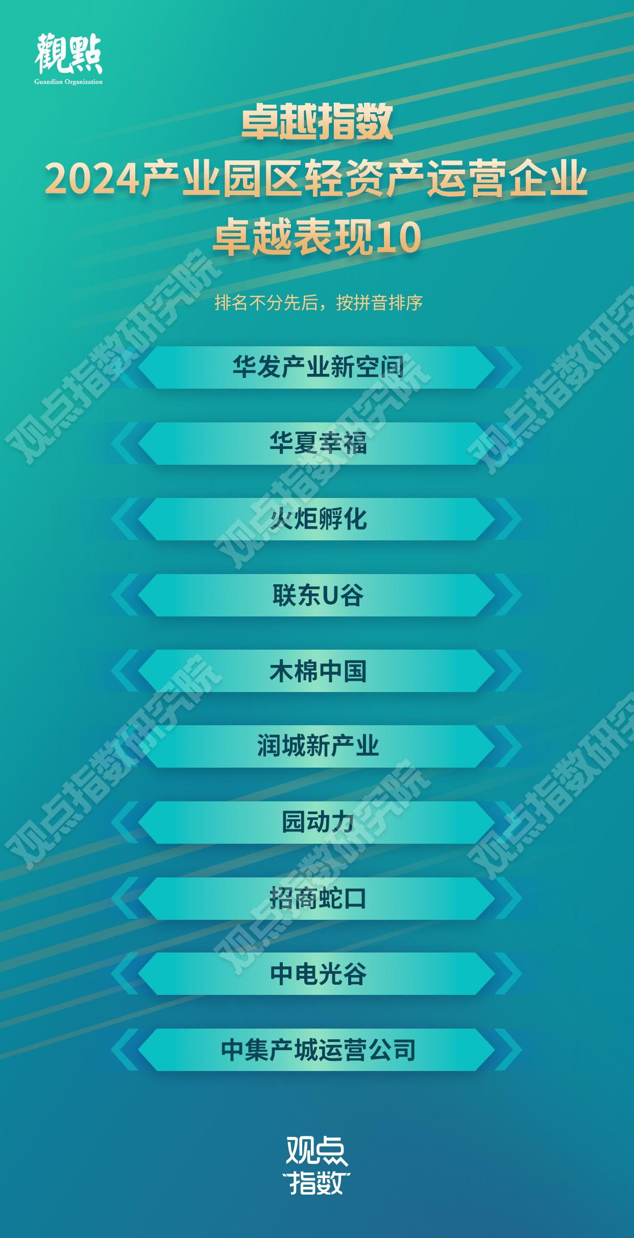 在政策的引導(dǎo)和支持下,輕資產(chǎn)服務(wù)不僅被視為解決產(chǎn)能過剩問題的新路徑,也成為盤活園區(qū)存量資產(chǎn)、滿足市場需求的重要方式。為盤點(diǎn)以及借鑒那些具有卓越成果的輕資產(chǎn)產(chǎn)業(yè)運(yùn)營企業(yè) ,觀點(diǎn)指數(shù)研究院通過長期跟蹤與監(jiān)測,并結(jié)合各項(xiàng)指標(biāo)、數(shù)據(jù)進(jìn)行分析研究,發(fā)布“卓越指數(shù) • 2024產(chǎn)業(yè)園區(qū)輕資產(chǎn)運(yùn)營企業(yè)卓越表現(xiàn)”,旨在挖掘并展示行業(yè)內(nèi)的佼佼者。