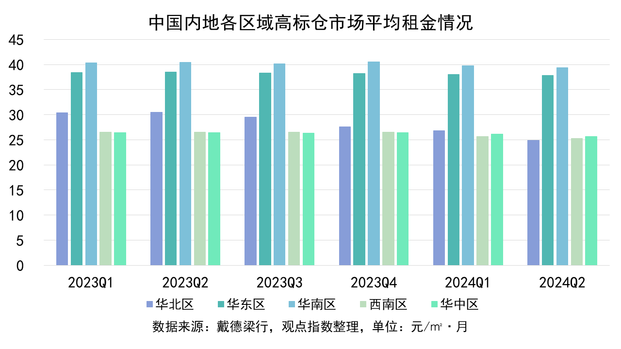 2024年二季度華北、華東地區(qū)的空置率均達(dá)到20%,其中,華北區(qū)的高標(biāo)倉市場平均租金已從2023年一季度的30.4元/㎡/月降至24.9元/㎡/月,空置率不抑反漲。