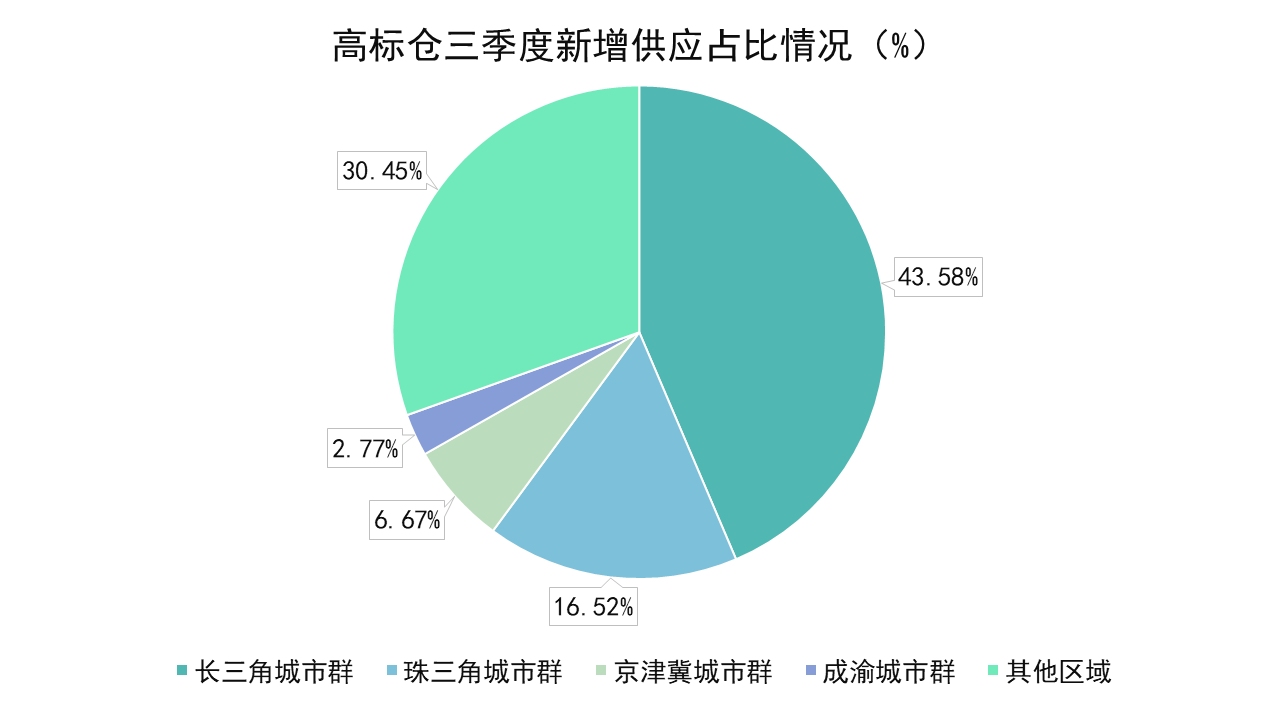 供應端,據(jù)物聯(lián)云倉數(shù)據(jù),2024年前三季度,高標倉新增供應主要集中在長三角城市群,該區(qū)域Q1-Q3的新增供應占比分別為25.1%、37.63%、43.58%,逐漸增大。