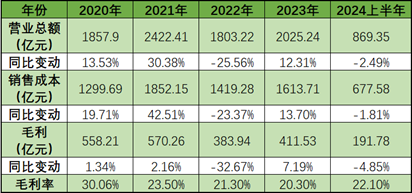 中海2020-2023年及2024H1營收結(jié)構(gòu)(內(nèi)圈為2020年),來源:企業(yè)公告,觀點(diǎn)指數(shù)整理