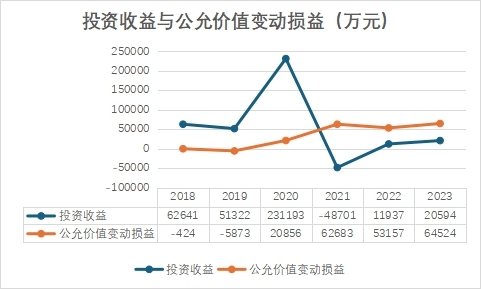 如果只看最近三年投資收益,似乎處于低谷,但需要注意,這些資產(chǎn)因市場價格波動還會產(chǎn)生公允價值變動損益。2018年至2023年,張江高科公允價值變動損益分別為-424萬元、-5873萬元、2.08億元、6.27億元、5.32億元和6.45億元,尤其是近三年已經(jīng)超過投資收益。