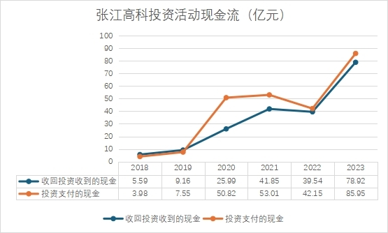 產(chǎn)業(yè)投資也在持續(xù)加倉,張江高科2018年至2023年投資活動產(chǎn)生的現(xiàn)金流量凈額分別為6.49億元、5.06億元、-28.07億元、-16.69億元、-12.64億元和-21.09億元,其中投資支付的現(xiàn)金這一項分別為3.98億元、7.55億元、50.82億元、53.01億元、42.15億元和85.95億元。