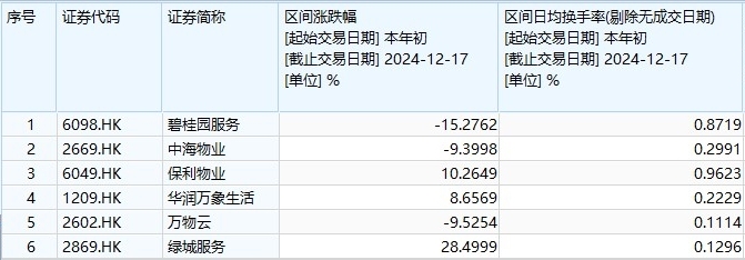 換手率方面,由于大多數(shù)物企都面臨業(yè)績下滑、股價下跌等壓力,物業(yè)股整體流動性也變得緊張。根據(jù)Wind數(shù)據(jù)顯示,2024年年初至12月17日,65家上市物企中有近九成日均換手率低于1%。