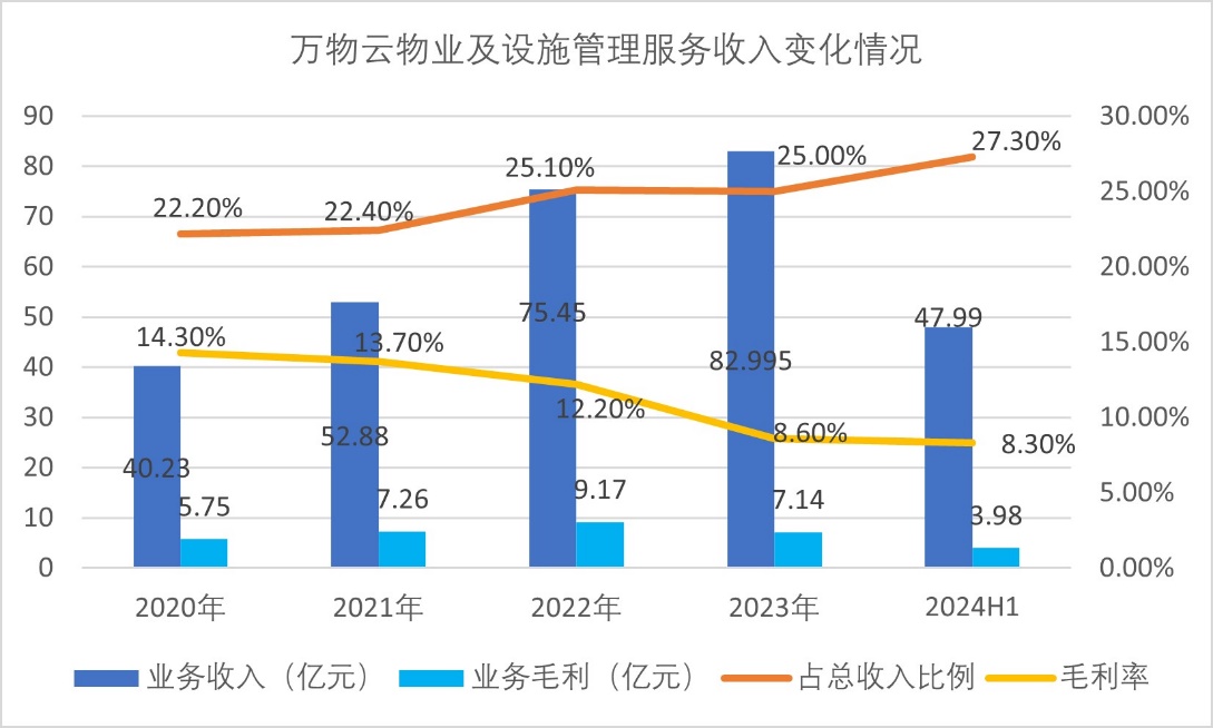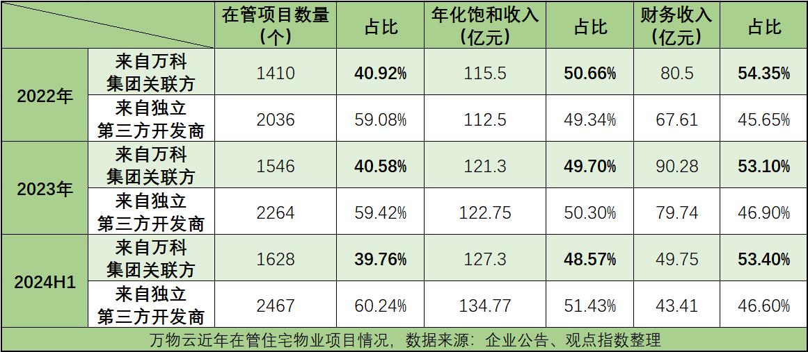 截止到2024上半年,萬物云與開發(fā)商有關(guān)的收入占比為12.6%,同比下降5.0個百分點;期內(nèi)公司總收入175.6億元,在剔除開發(fā)商影響后降至153.56億元。