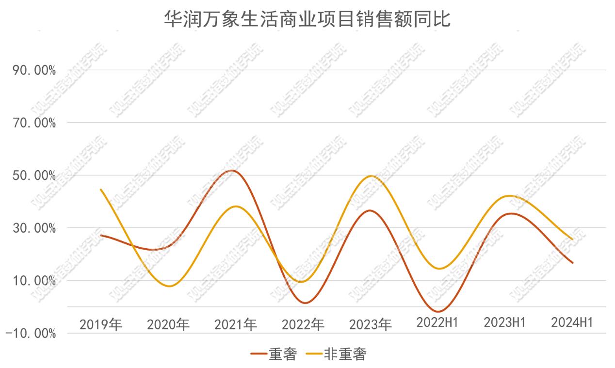 至于華潤萬象生活方面,同樣受到高端消費(fèi)整體環(huán)境的影響。2024上半年數(shù)據(jù)顯示,商業(yè)零售額同比增長19.7%,可同比增長7.6%;但重奢項(xiàng)目零售額同比增長9.6%,可同比增長4.0%,表現(xiàn)弱于整體,與非奢項(xiàng)目也有明顯差距,后者同比增長26.7%,可同比增長10.0%。