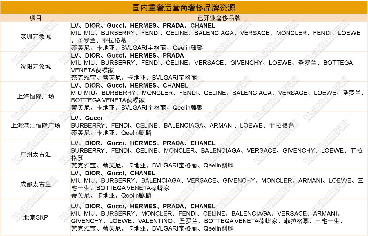 奢侈品品牌眾多,但能稱之為頂奢的屈指可數(shù),主要包括LV路易威登、DIOR迪奧、Gucci古馳、Hermès愛馬仕、PRADA普拉達(dá)、CHANEL香奈兒,是否引入上述品牌也是衡量重奢商業(yè)項(xiàng)目競爭力的重要指標(biāo)。