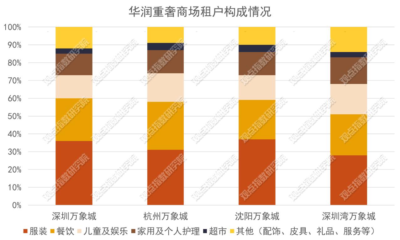 據(jù)觀點(diǎn)指數(shù)了解,華潤萬象生活重奢商場引入的品牌業(yè)態(tài)主要包括服裝、餐飲、兒童及娛樂、超市、家用及個(gè)人護(hù)理、其他(配飾、皮具、禮品、服務(wù)等)六大類。