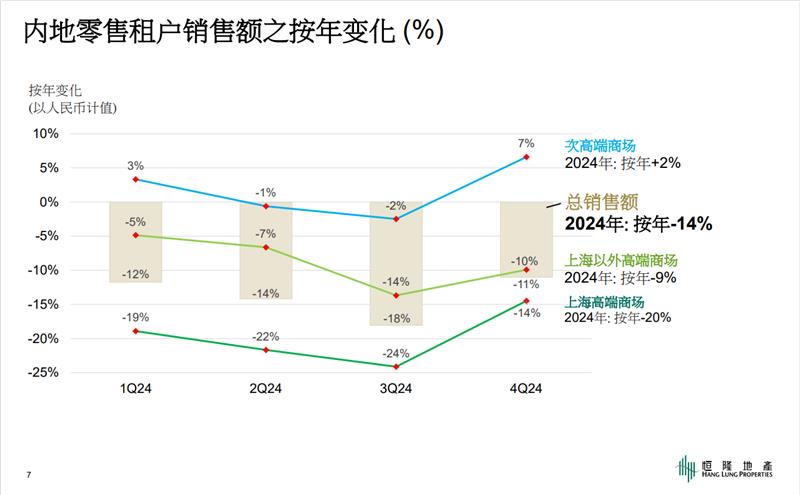 資料顯示,恒隆地產(chǎn)內(nèi)地零售租戶銷售額同比變化情況,在2024年Q3達到谷底。其時,恒隆內(nèi)地零售租戶總銷售額下滑幅度達18%,上海高端商場數(shù)據(jù)同比下跌了24%,上海以外高端商場同比下跌14%,次高端商場同比下跌2%。