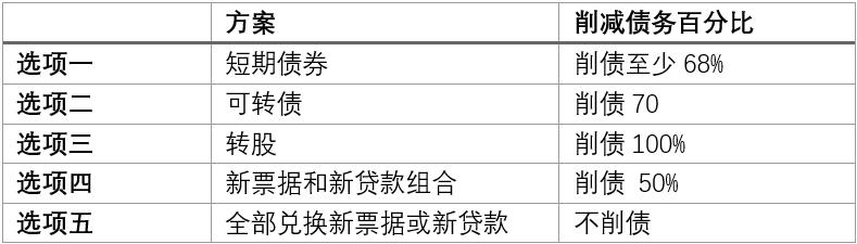 關(guān)于償付時(shí)間,無(wú)論是選擇美元計(jì)價(jià)的新票據(jù)或新貸款、強(qiáng)制性可轉(zhuǎn)換債券或者是以人民幣為計(jì)價(jià)的新貸款,償付時(shí)間介于2-9年不等,最長(zhǎng)周期可延長(zhǎng)至9年。