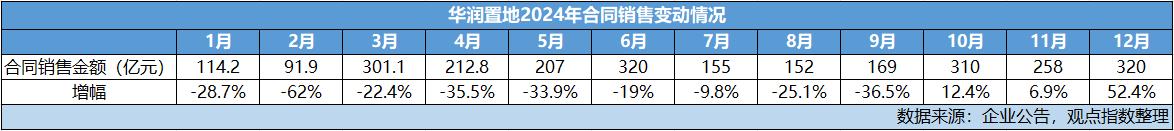 雖然在幾個核心城市表現(xiàn)不錯,但行業(yè)整體下滑是明顯的。2024年全年,華潤置地合同銷售額同比下滑了15%。分月份來看,第四季度有所起色。