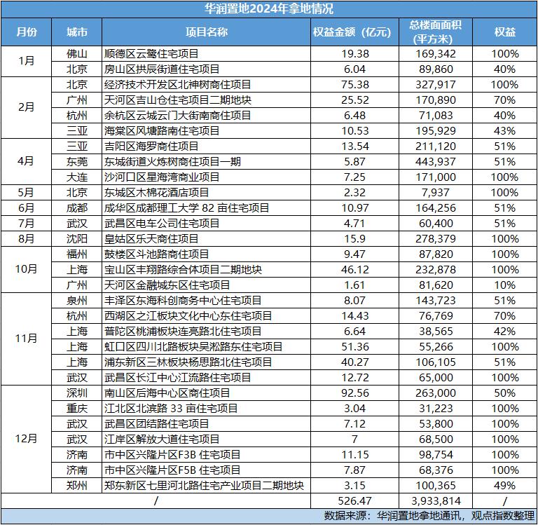 2024年,華潤置地拿地力度有所縮減,全年拿地29宗,新增土儲計容建筑面積為393.38萬平方米,但權(quán)益金額仍達到526.47億元。