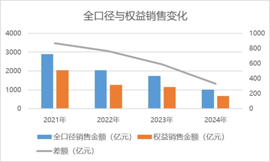據(jù)觀點(diǎn)指數(shù)發(fā)布的近年榜單,龍湖全口徑銷售金額與權(quán)益銷售金額的差額由2021年約870億元下降至2024年331.7億元。一般而言,差額的增減并非單一原因造成,不過(guò)差額過(guò)大確實(shí)會(huì)被業(yè)內(nèi)解讀為夸大銷售表現(xiàn)的“注水”行為。
