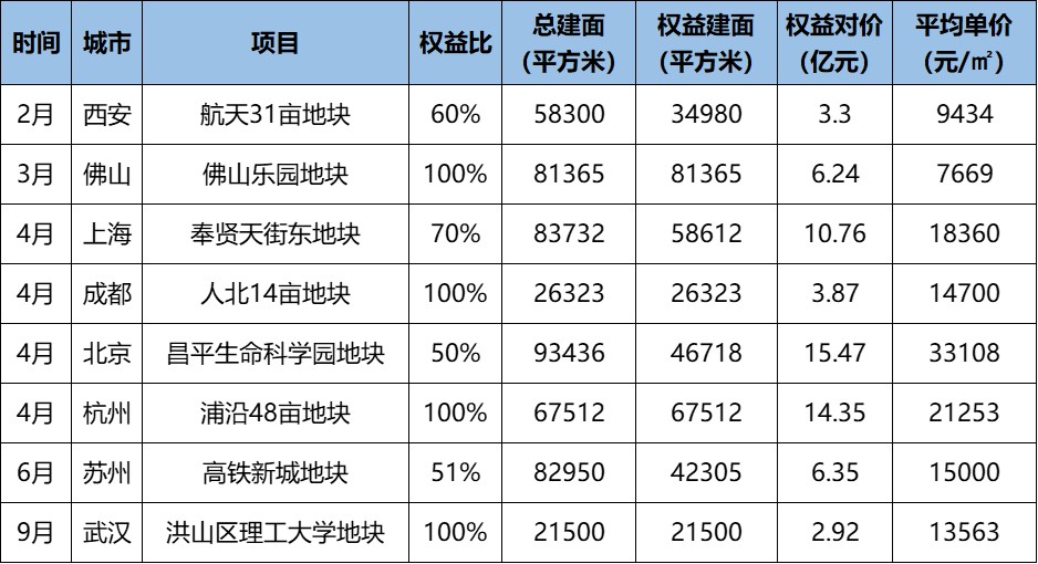 2023年,龍湖集團(tuán)在全國(guó)17個(gè)重點(diǎn)城市共獲取了31幅土地,權(quán)益建面266萬(wàn)平方米,權(quán)益地價(jià)259億,總貨值超過(guò)770億。2024年拿地動(dòng)作明顯減少,截至11月共計(jì)新增8宗地塊,權(quán)益拿地金額僅為63.26億元。