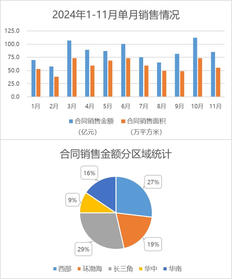 最新數(shù)據(jù)顯示,龍湖集團(tuán)2024年累計(jì)實(shí)現(xiàn)總合同銷售金額1011.2億元,合同銷售面積712.4萬(wàn)平方米,分別同比下降41.7%、34%。西部及長(zhǎng)三角地區(qū)為銷售貢獻(xiàn)主力,分別銷售274.7億元、290.6億元,環(huán)渤海、華中、華南地區(qū)分別銷售194.8億元、96.1億元、155億元。