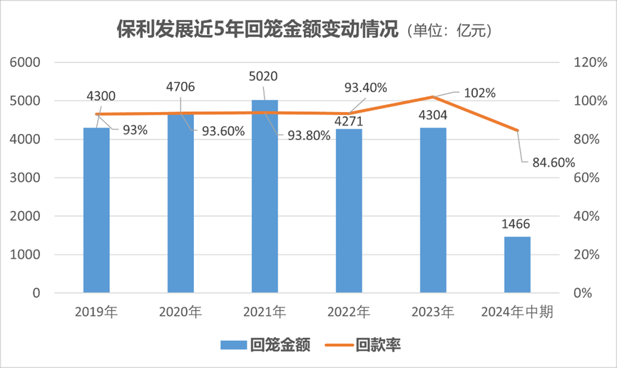 據(jù)保利發(fā)展2024年中期報告,受二季度銷售占比高、當期回籠周期短的影響,公司期內(nèi)累計實現(xiàn)回籠金額1466億元,回籠率84.6%。該項數(shù)據(jù)在2023年同期約為2273億元、96%。