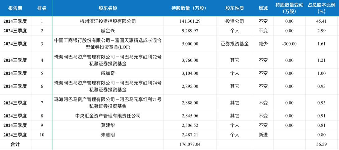 2024年三季度濱江前十大流通股東