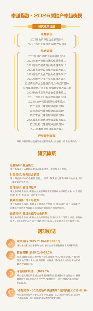 在房地產(chǎn)行業(yè)正在“穿過風(fēng)暴”的當(dāng)下,每一家企業(yè)都在為塑造行業(yè)新格局而努力。為了表彰卓越,樹立行業(yè)標(biāo)桿,觀點(diǎn)機(jī)構(gòu)于3月20-21日主辦的“卓越指數(shù) •2025房地產(chǎn)卓越表現(xiàn)授牌典禮” 將榮耀開啟房地產(chǎn)企業(yè)評(píng)選、排行與授牌活動(dòng)!