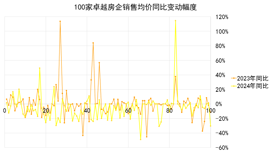 進一步可以看到,2024年銷售均價同比上升的企業(yè)數量明顯要少于2023年,并且同比均價降幅散點有往下的趨勢。