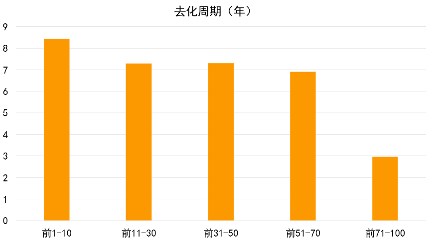 根據計算結果,前100房企土地儲備為22.15億平方米,平均去化周期為5.85年,比去年縮短約2年。其中,前10房企去化周期6.66年;前71-100房企的土地儲備收縮較明顯,未來去化周期在3年以內。