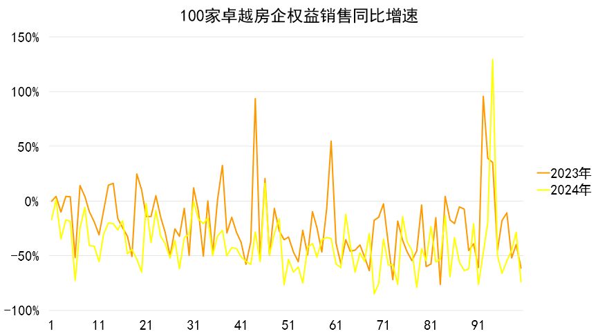具體來看,2024年卓越100大部分企業(yè)的權益銷售金額較去年有所減少,極少數企業(yè)權益銷售實現同比增長,最高增長率為129.38%,最大降幅為84.83%,同比增速中位數為-42%。(2023年最高增長率為95.8%,最大降幅為76.2%,同比增速中位數為-25.4%)