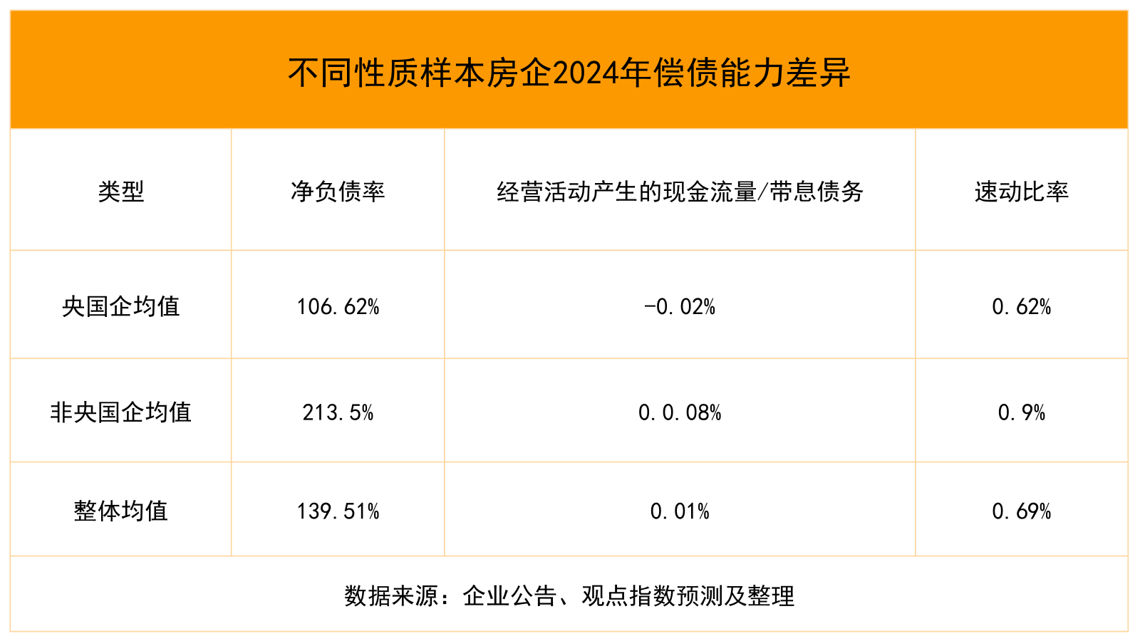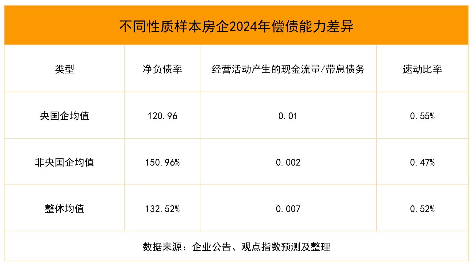 樣本房企2024年凈負(fù)債率從109.91%上升到132.52%,已獲利息倍數(shù)從5.51下降到2.67,經(jīng)營活動現(xiàn)金流/帶息債務(wù)從0.08下降到0.01,速動比率持平,2023年0.52,2024年0.52。數(shù)據(jù)顯示,上市房企償債能力沒有改善,在盈利能力下滑趨勢下,償債壓力依然很大。