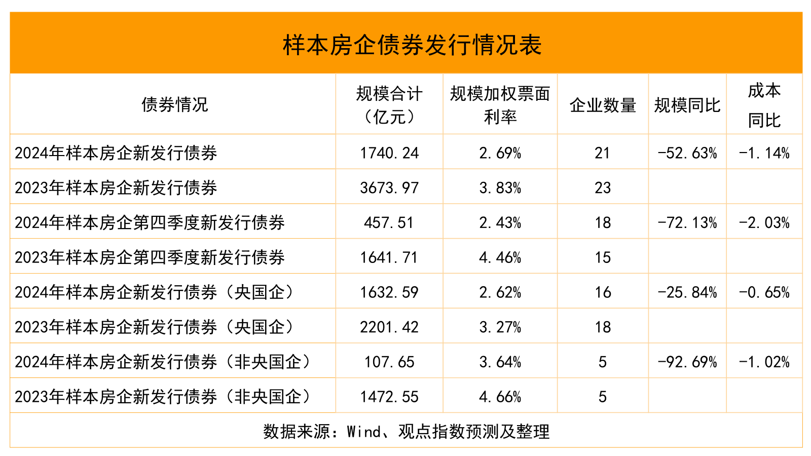 債券融資規(guī)模和成本同時下降。樣本房企的債券數(shù)據(jù)顯示,2023年新發(fā)債券總規(guī)模為3673.97億元, 2024年總規(guī)模下降到1740.24億元,下降幅度為52.63%。成本上,2023年和2024年的規(guī)模加權(quán)平均票面利率分別為3.83%和2.69%,2024年下降了1.14%。