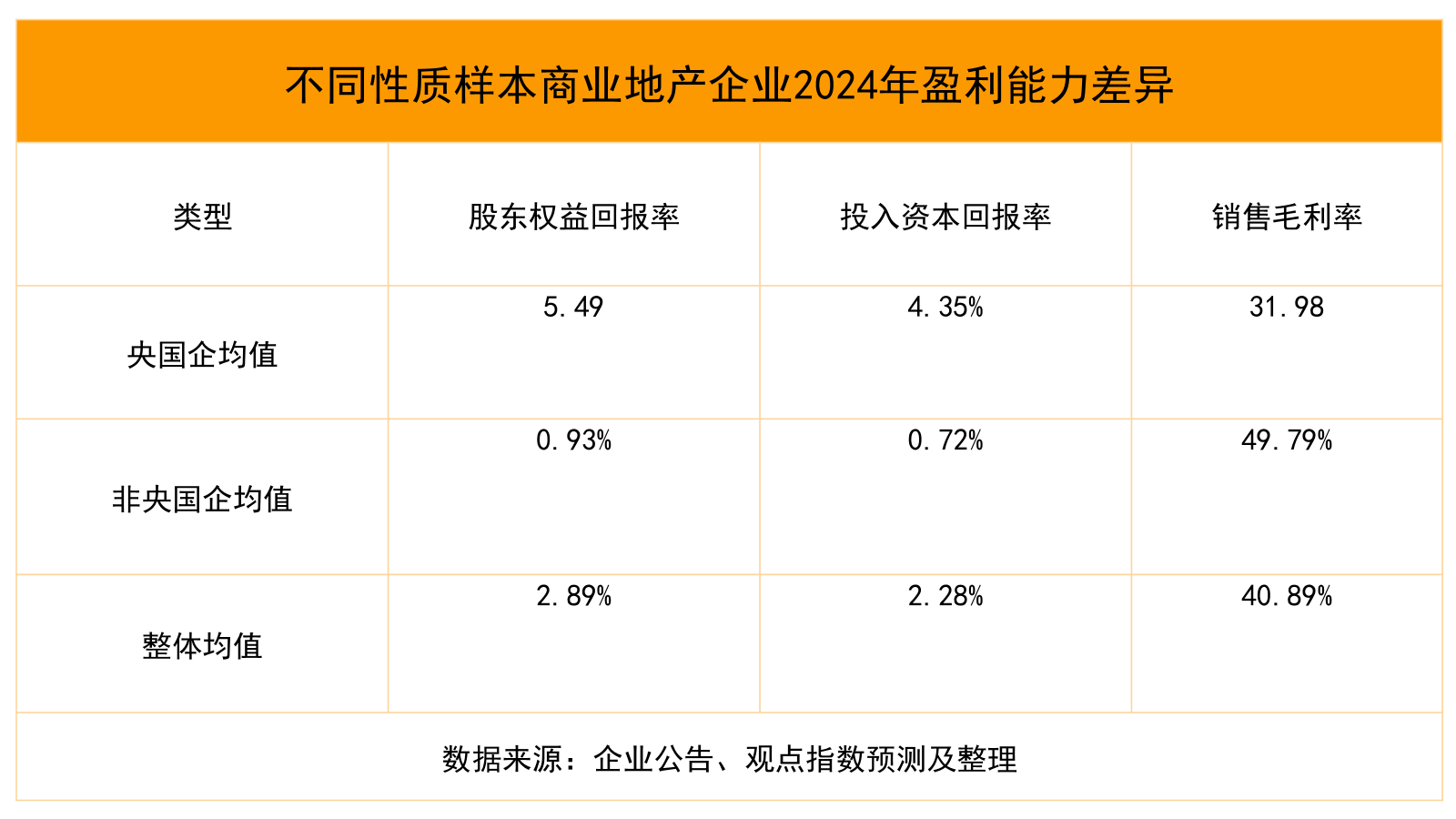 分企業(yè)性質(zhì)看,國資背景商業(yè)地產(chǎn)企業(yè)在股東權(quán)益回報率和投入資本回報率上遠(yuǎn)優(yōu)于非國資背景的商業(yè)地產(chǎn)企業(yè),但是銷售毛利率卻低于后者。這種現(xiàn)象或是國資背景企業(yè)在資本運作上具備顯著優(yōu)勢,通常能夠以較低的成本獲取資金,例如,央企在土地獲取方面擁有較強的議價能力,土地成本相對較低,讓其在開發(fā)階段的成本控制較為有利。此外,國資委對國有企業(yè)的資本回報率有明確要求,通常設(shè)定為不低于11%,這也讓國資企業(yè)更加注重資本效率。這些因素共同提升了國資企業(yè)的ROE和ROIC。