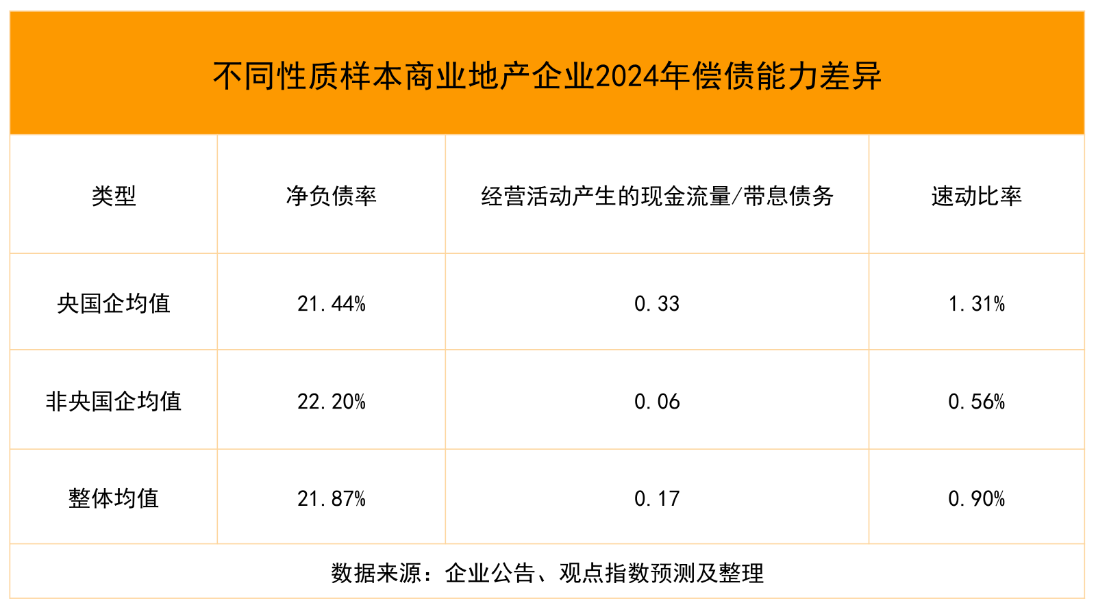 樣本商業(yè)地產(chǎn)企業(yè)2024年的凈負(fù)債率從14.76%上升到21.87%,經(jīng)營活動產(chǎn)生的現(xiàn)金流量/帶息債務(wù)從0.49下降到0.19,速動比率變化不大,從0.91到0.90。