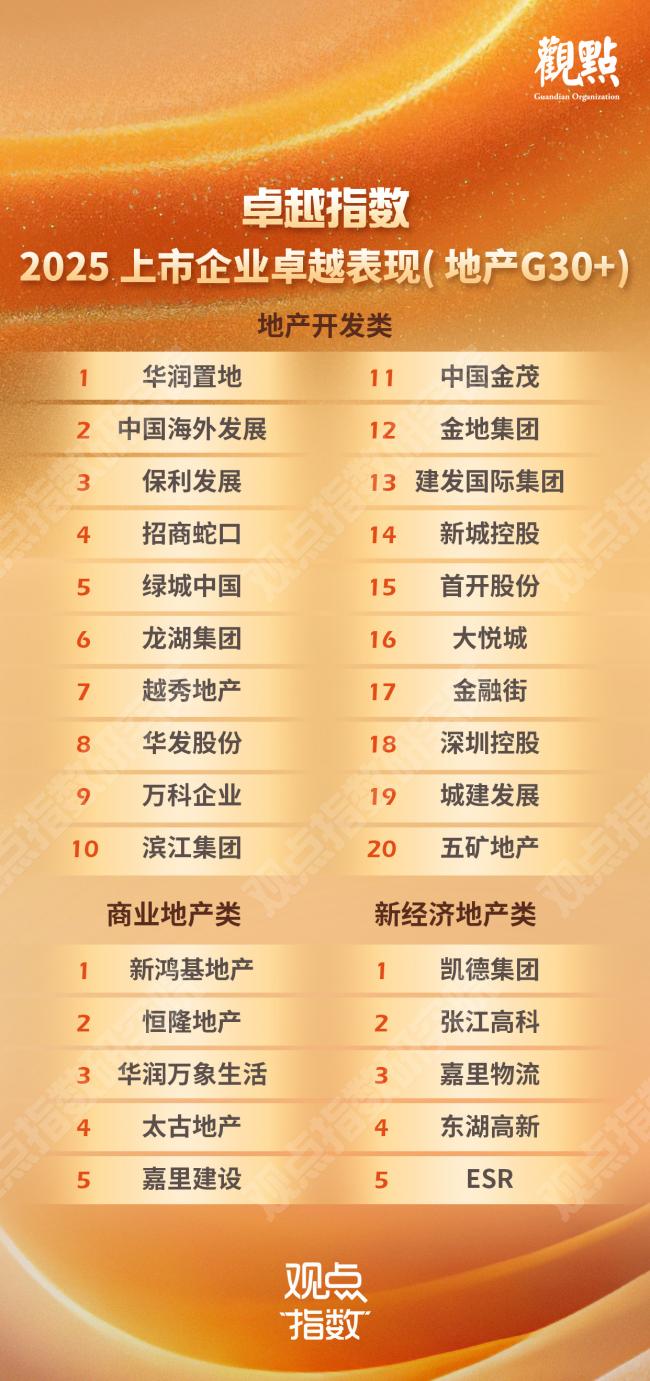 2025上市企業(yè)卓越表現(xiàn)(地產(chǎn)G30+),綜合評估地產(chǎn)開發(fā)、商業(yè)地產(chǎn)、新經(jīng)濟地產(chǎn)三大類上市主體的營運、財務(wù)、品牌、管理、模式與創(chuàng)新表現(xiàn),對過去一年表現(xiàn)突出的企業(yè)予以肯定。