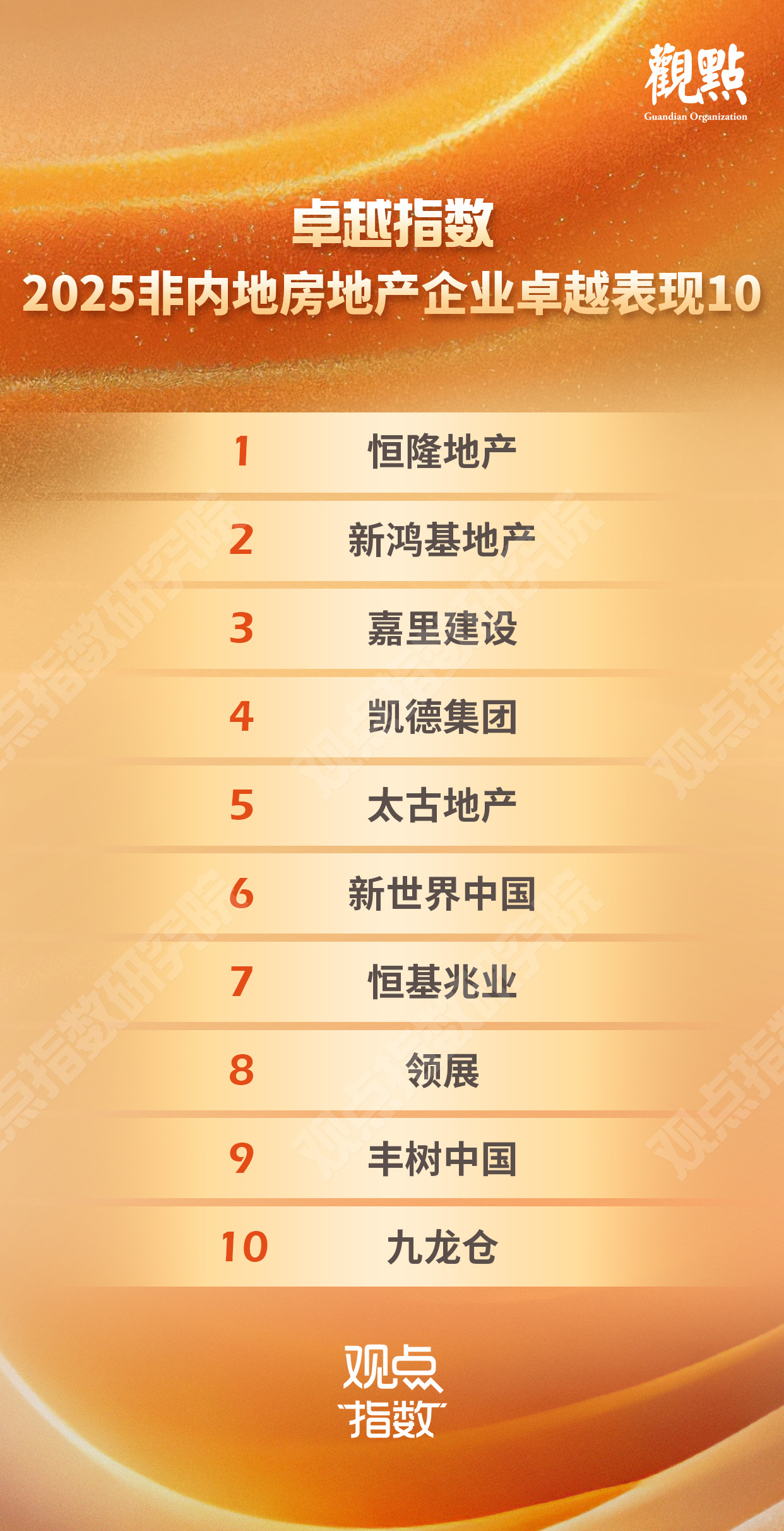 2025非內(nèi)地房地產(chǎn)企業(yè)卓越表現(xiàn)10,研究對(duì)象是所有在中國(guó)內(nèi)地開(kāi)發(fā)、投資及運(yùn)營(yíng)項(xiàng)目的非內(nèi)地房地產(chǎn)企業(yè),評(píng)估指標(biāo)包括營(yíng)運(yùn)、管理、模式與創(chuàng)新、品牌等。