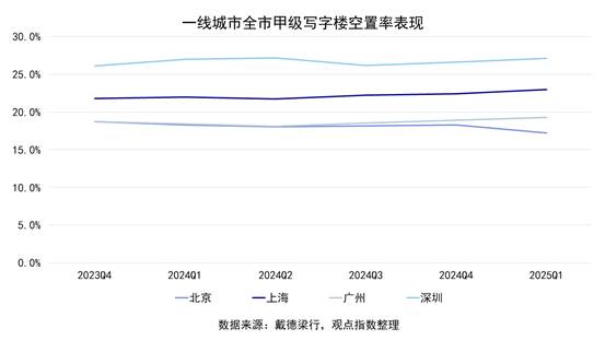 2025年第一季度延續(xù)下滑趨勢,辦公市場仍處于深度調(diào)整期,市場復蘇面臨較大壓力。