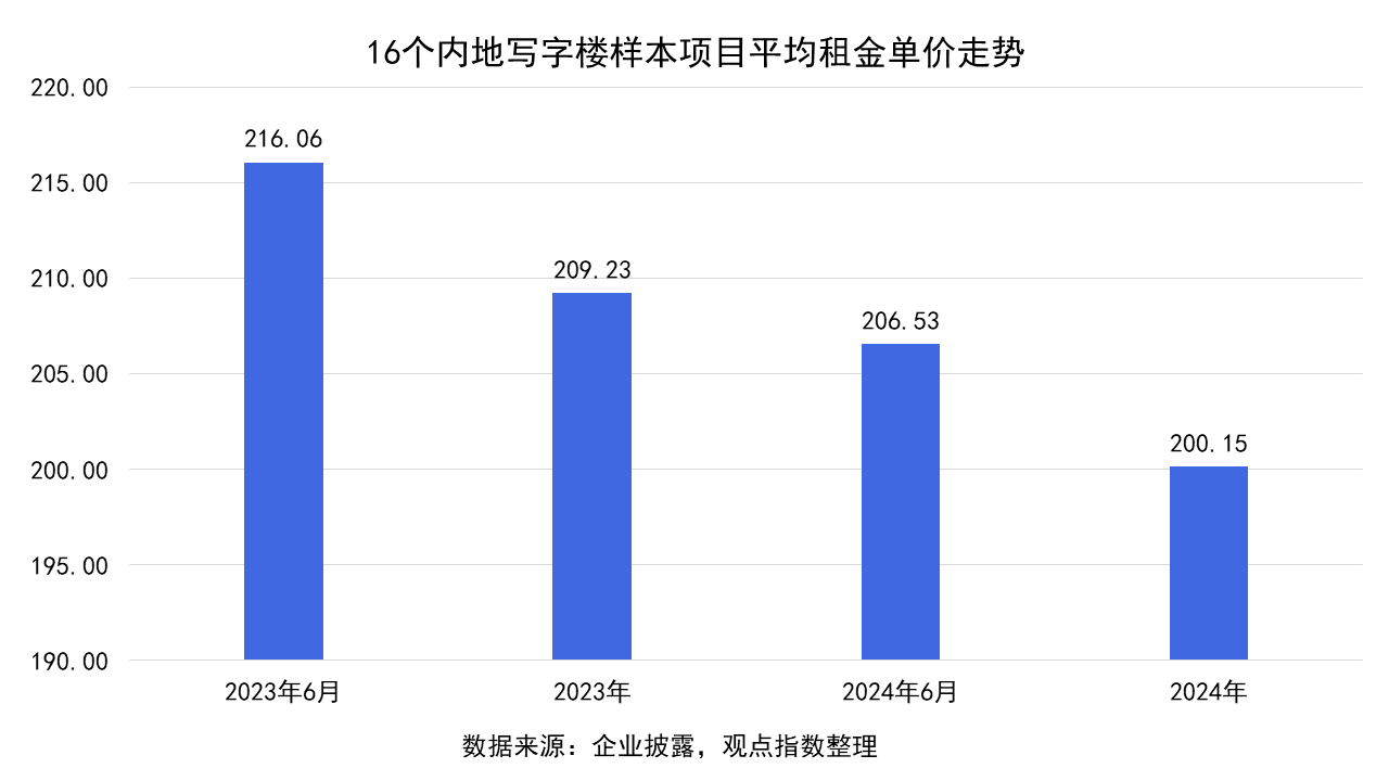 據(jù)觀點指數(shù)統(tǒng)計,截至2024年末,涵蓋北京、上海、廣州、深圳、杭州、重慶等重點城市的16個中國內地寫字樓樣本項目,其租金單價為200.15元/平方米/月。相較于2024年6月末,該租金單價下降了3.09%。