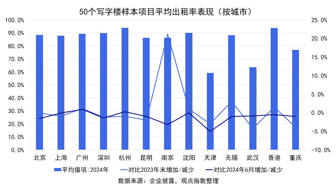 分項目表現(xiàn)看,有8個寫字樓樣本項目出租率超95%,其中包括上海興業(yè)太古匯、杭州維多利、科技大廈、科技大廈二期、上海浦東嘉里城、北京凱晨世茂中心以及恒基名人商業(yè)大廈等,在市場波動中展現(xiàn)出較強的抗周期韌性。