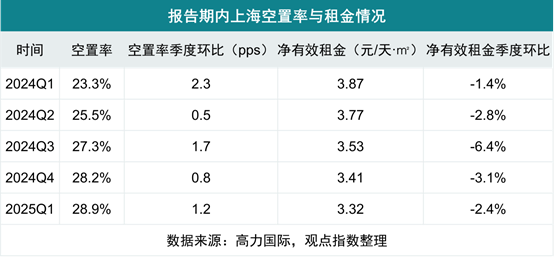 空置率與租金方面,據(jù)高力國際數(shù)據(jù),2024年年初至2025年年初,上海市場凈有效租金持續(xù)下降,空置率持續(xù)上升,以價換量模式繼續(xù)施行。